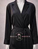 Sa coupe droite, sublimée par un col tailleur structuré et une ceinture à nouer, permet d’ajuster la silhouette avec raffinement tout en conservant une allure pudique.