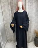 Abaya soie de medine noir, avec de jolie détails au niveau des bras, manches serrer en bas du détail à afin afin que les bras ne soit pas voyant.