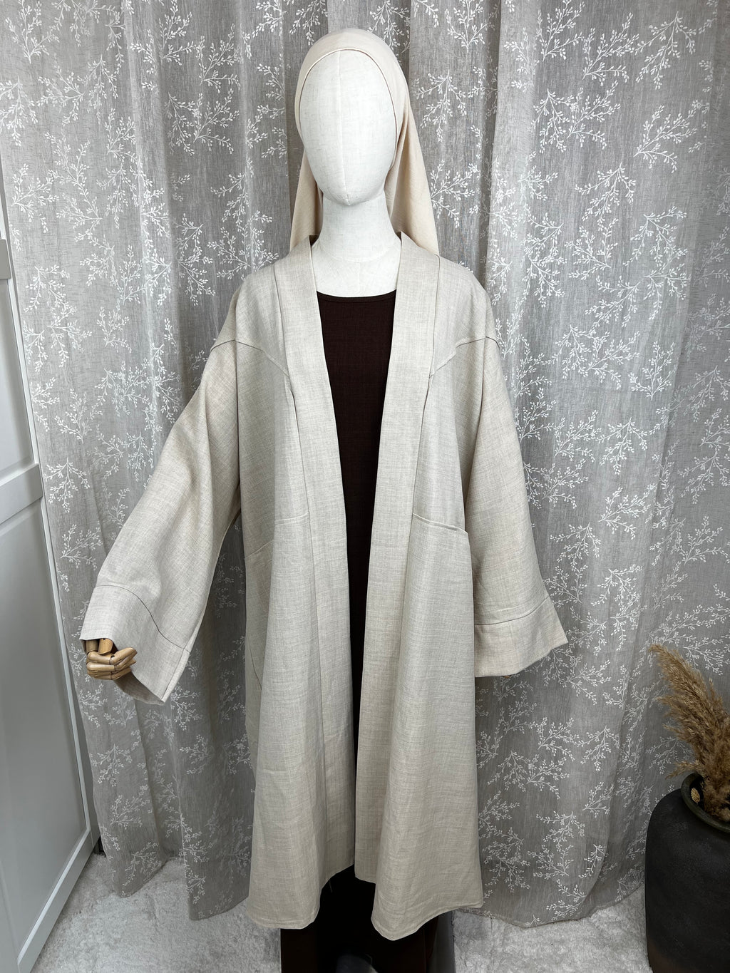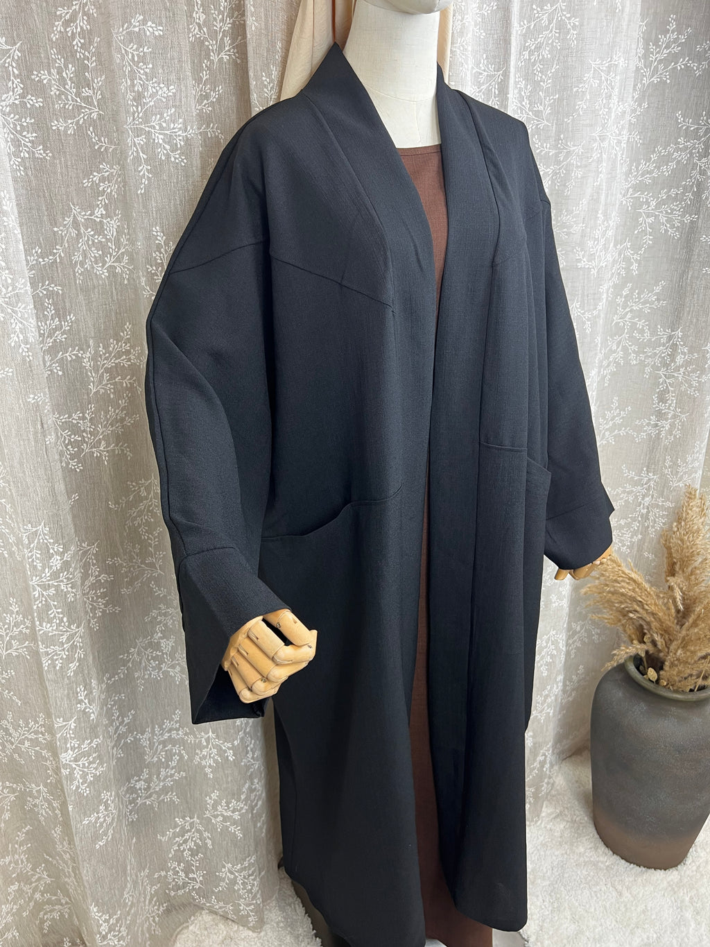 La Abaya effet Lin. Elle possède des manches ballons et avec détails. Cette Abaya est compatible à l’allaitement grâce à sa fermeture à boutons de haut en bas, peut se porter ouverte ou fermer en kimono ainsi qu’on abaya,