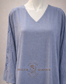 Son col en V apporte une touche de féminité tout en restant pudique, tandis que les manches longues sont sublimées par de délicates broderies florales ton sur ton.